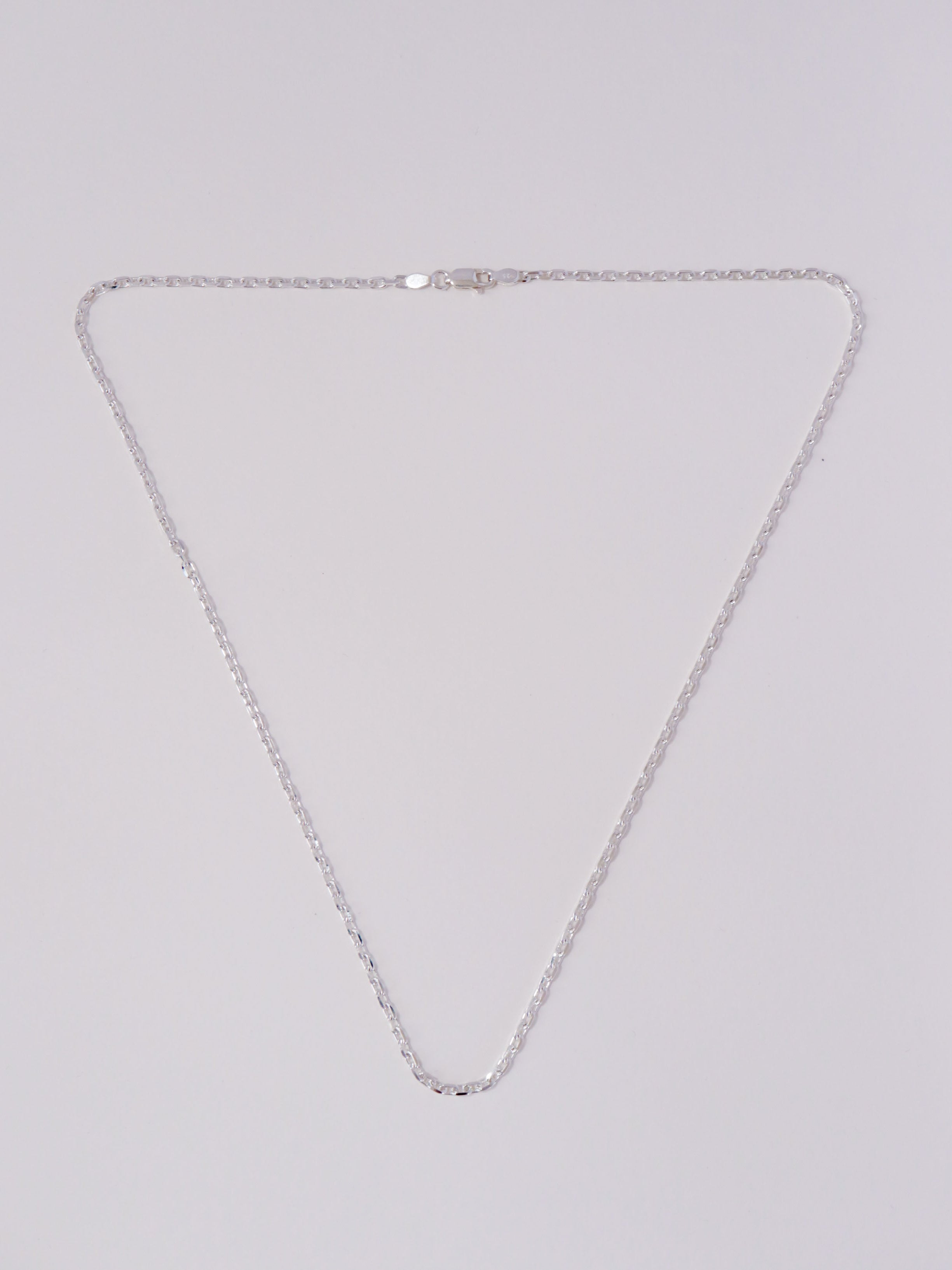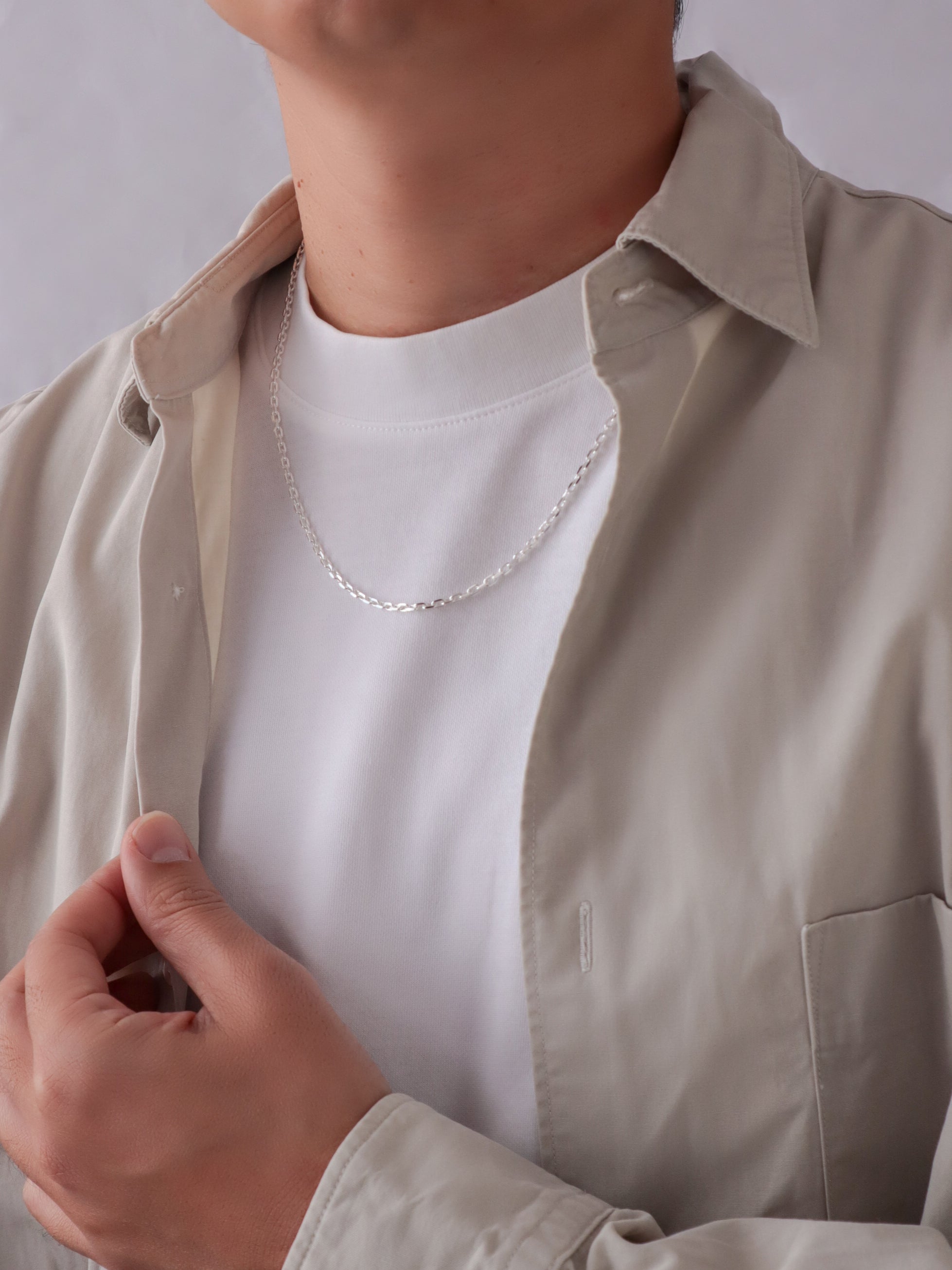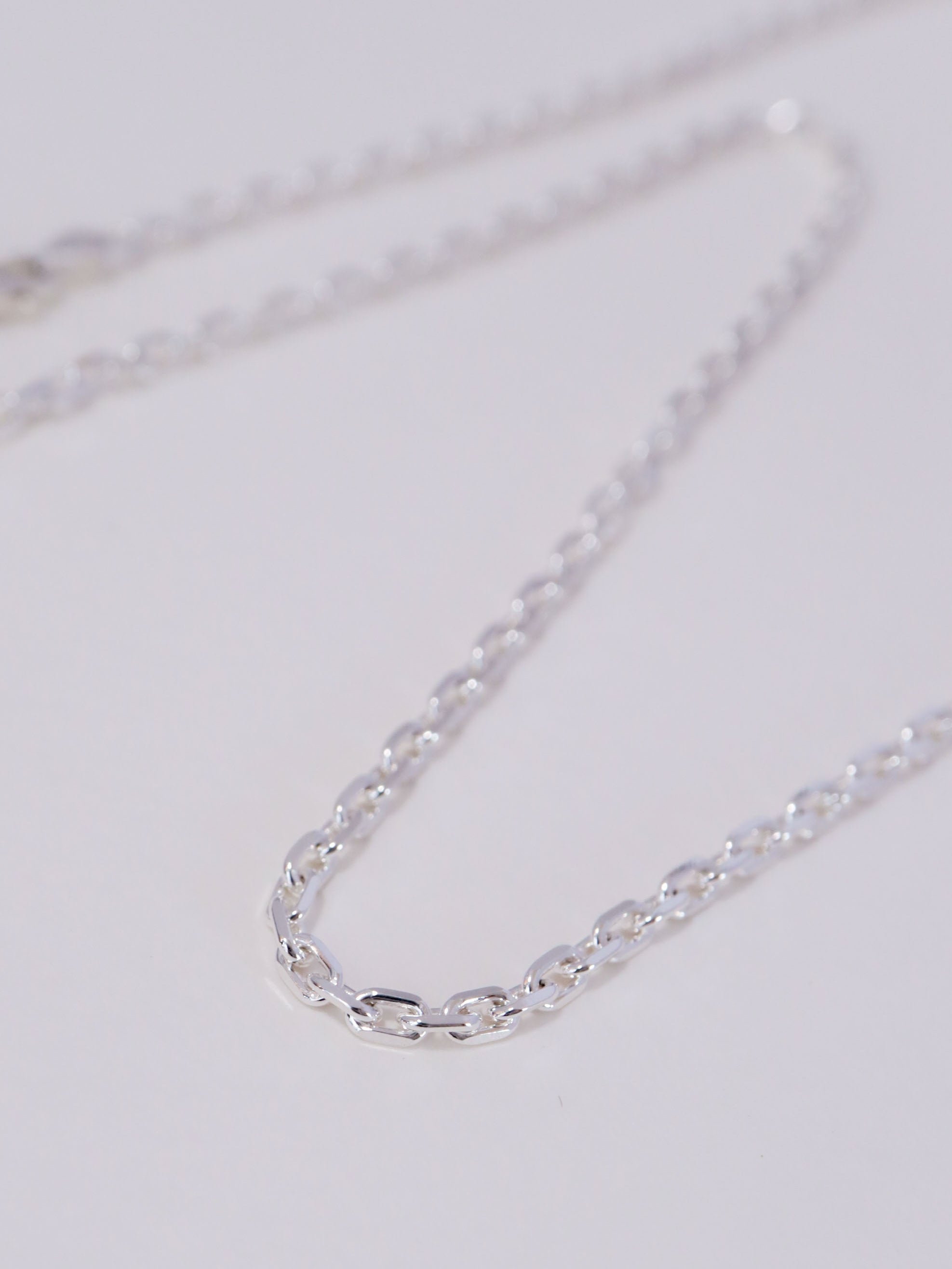 リンクにカットを施し、立体感のある豊かな表情に仕上げたケーブルチェーンネックレス。 イタリアで製作されたスターリングシルバー925の、動くたびに光を捉えて煌めく気品ある輝きが魅力です。2.5mmという程よいボリューム感は、胸元にモダンな印象と確かな存在感を与えます。 50cmのレングスは、Tシャツの上からさらりと纏(まと)ったり、開襟シャツのインナーに合わせるなど、季節やスタイルを問わず幅広い着こなしに馴染みます。ミニマルでありながら上品さを兼ね備えた、タイムレスな一本です。