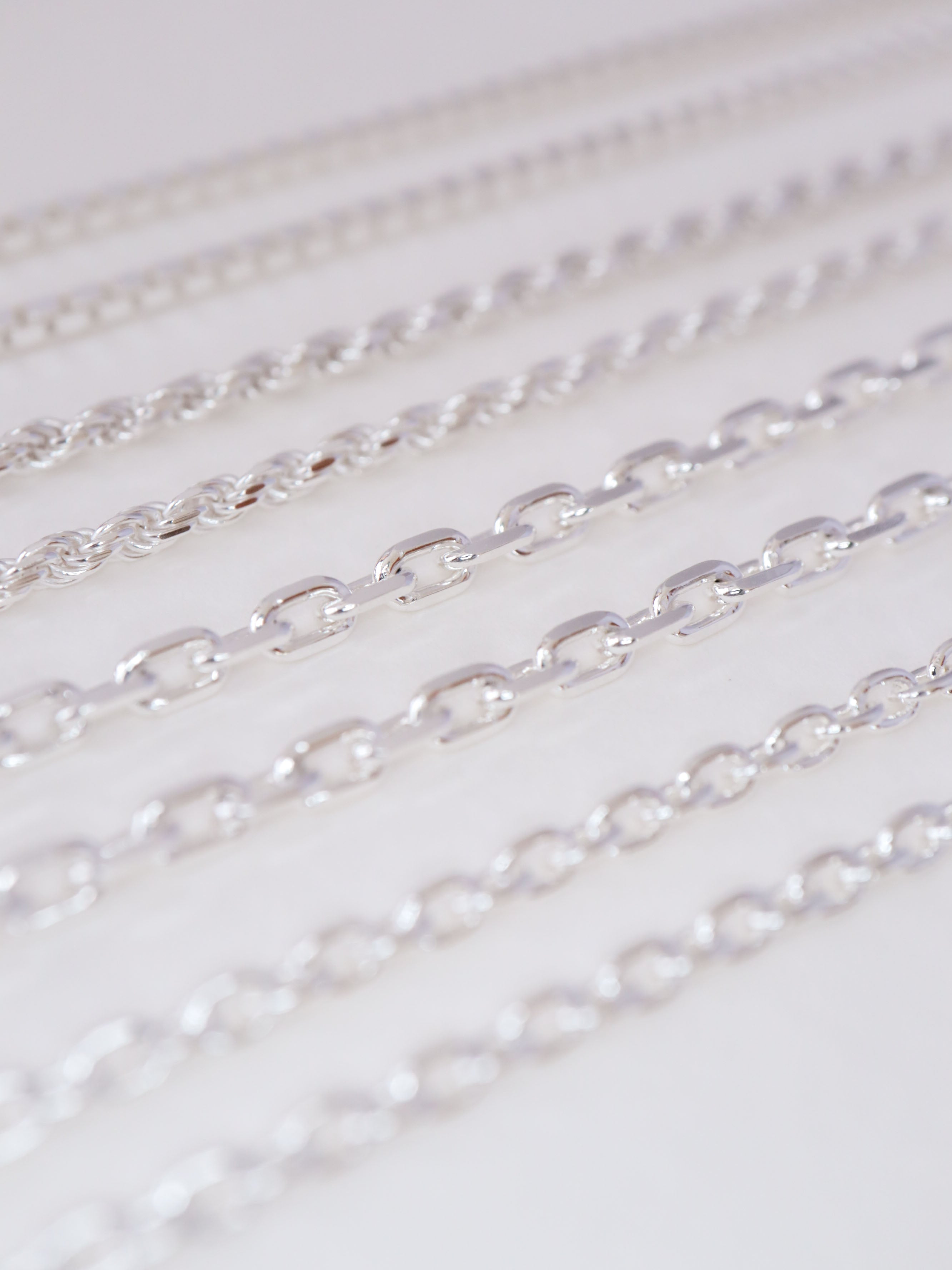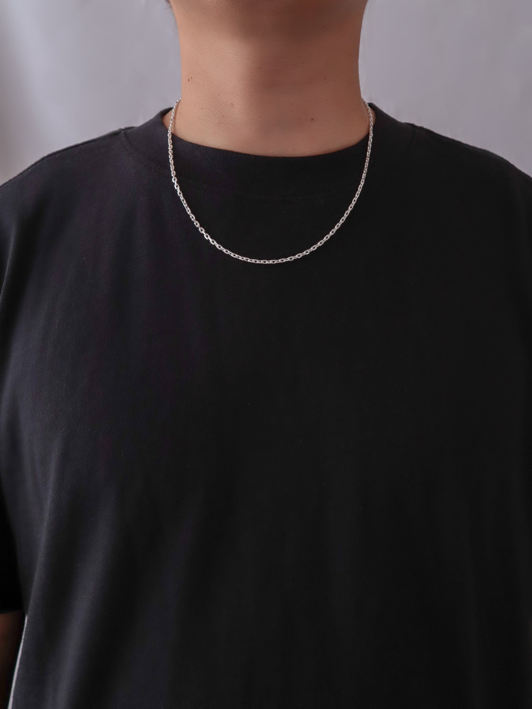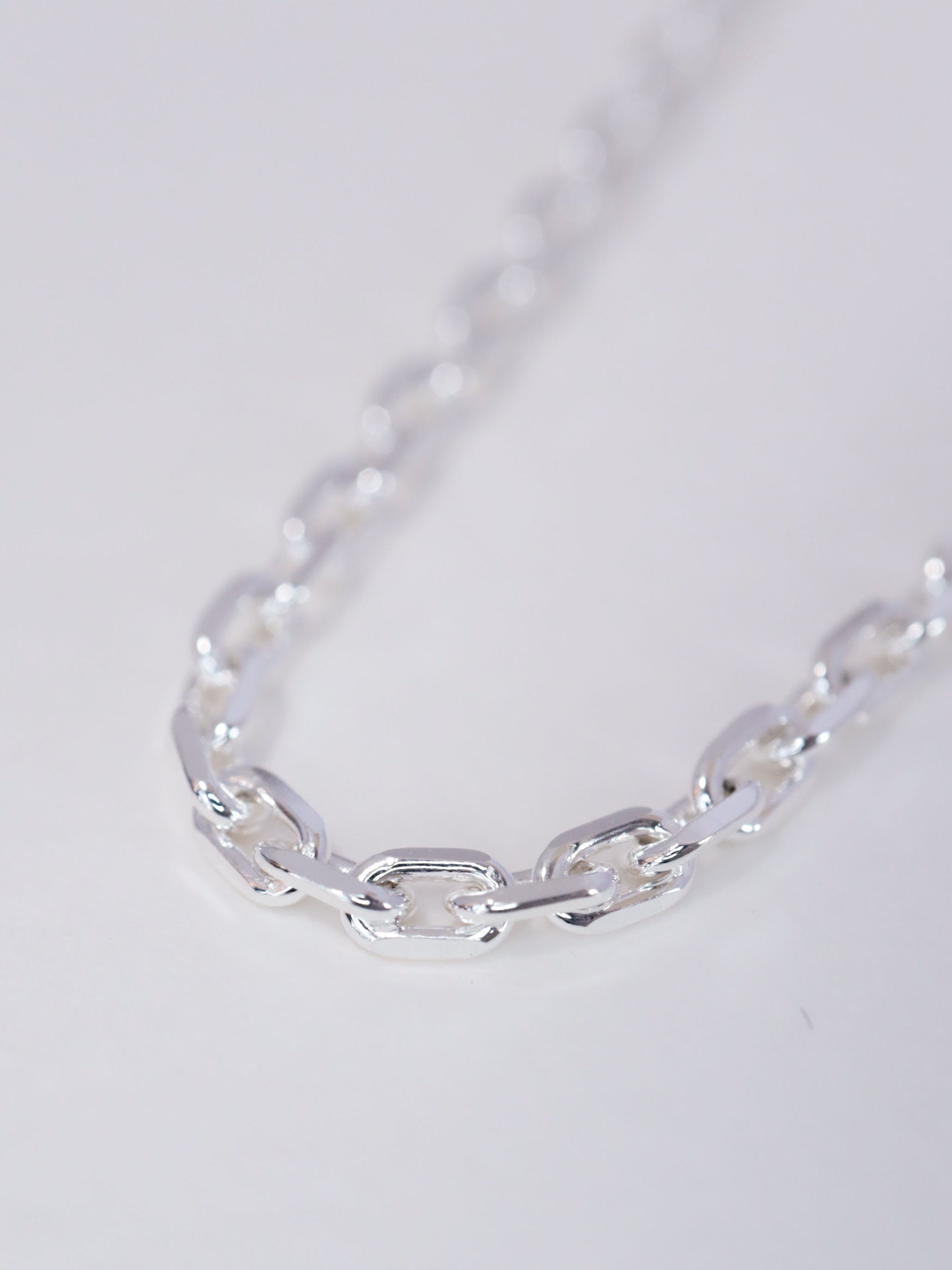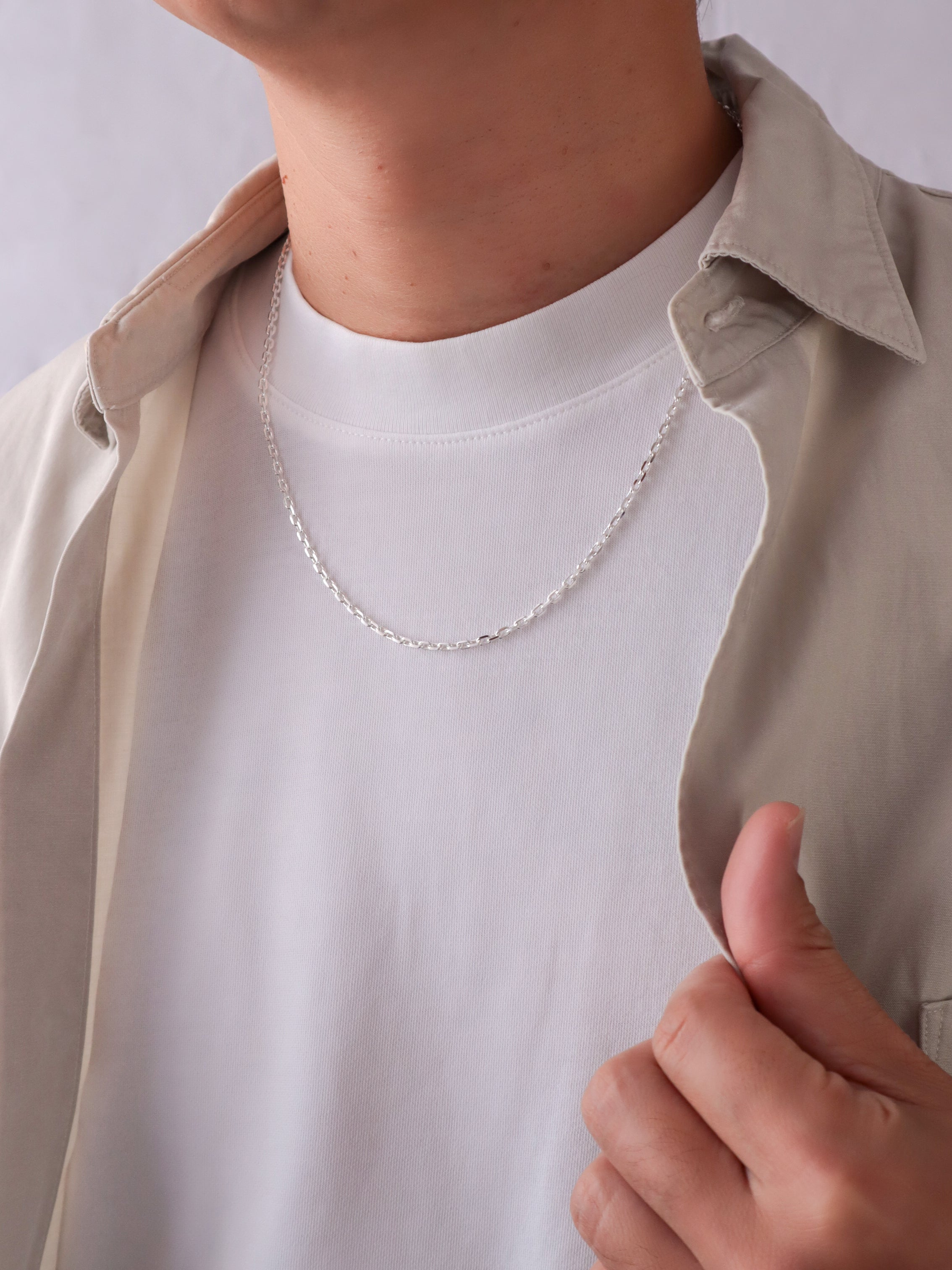 リンクにカットを施し、立体感のある豊かな表情に仕上げたケーブルチェーンネックレス。 イタリアで製作されたスターリングシルバー925の、動くたびに光を捉えて煌めく気品ある輝きが魅力です。2.5mmという程よいボリューム感は、胸元にモダンな印象と確かな存在感を与えます。 50cmのレングスは、Tシャツの上からさらりと纏(まと)ったり、開襟シャツのインナーに合わせるなど、季節やスタイルを問わず幅広い着こなしに馴染みます。ミニマルでありながら上品さを兼ね備えた、タイムレスな一本です。