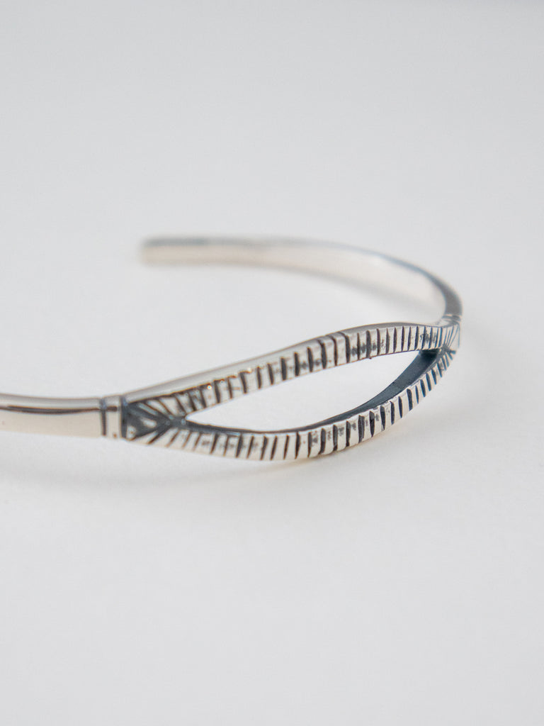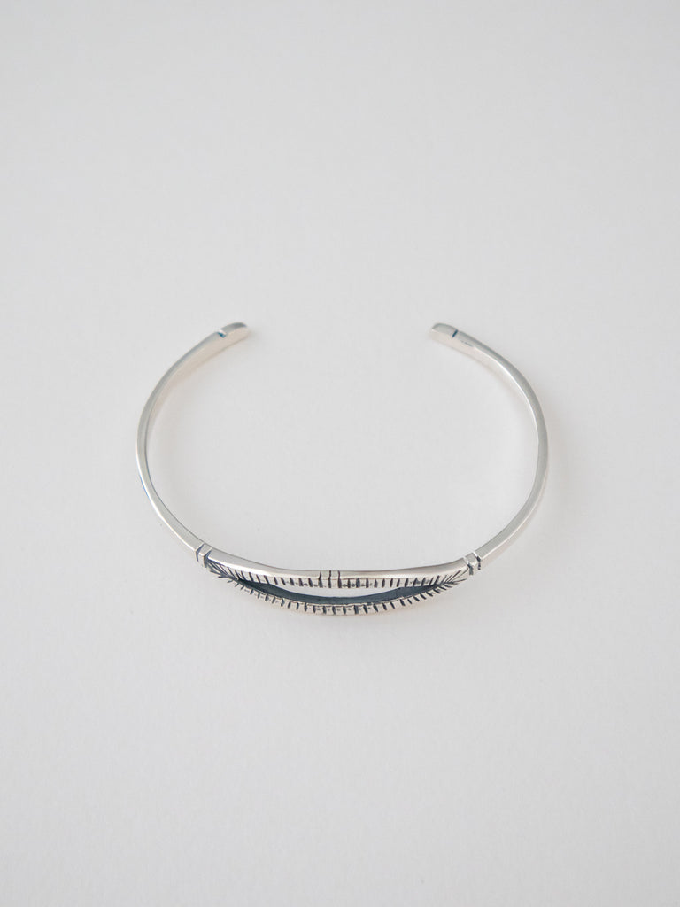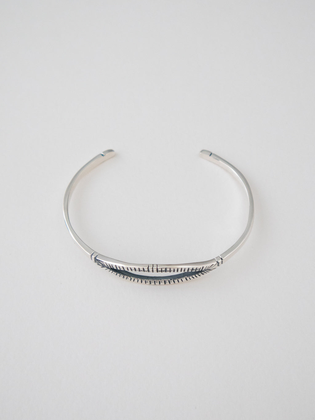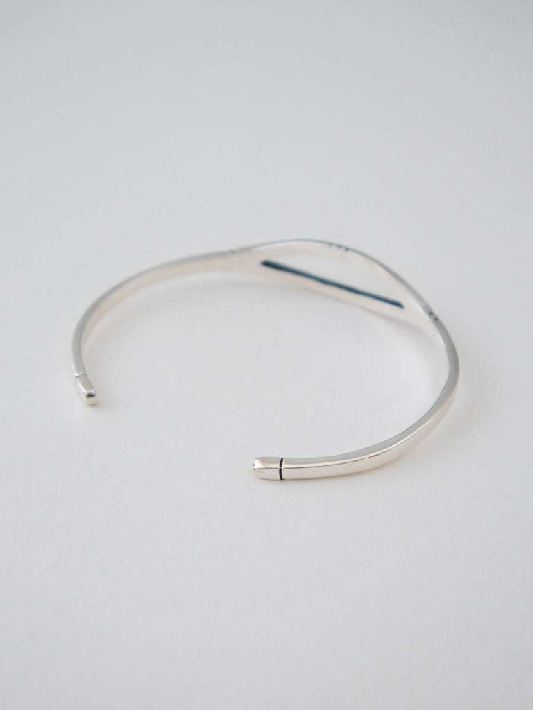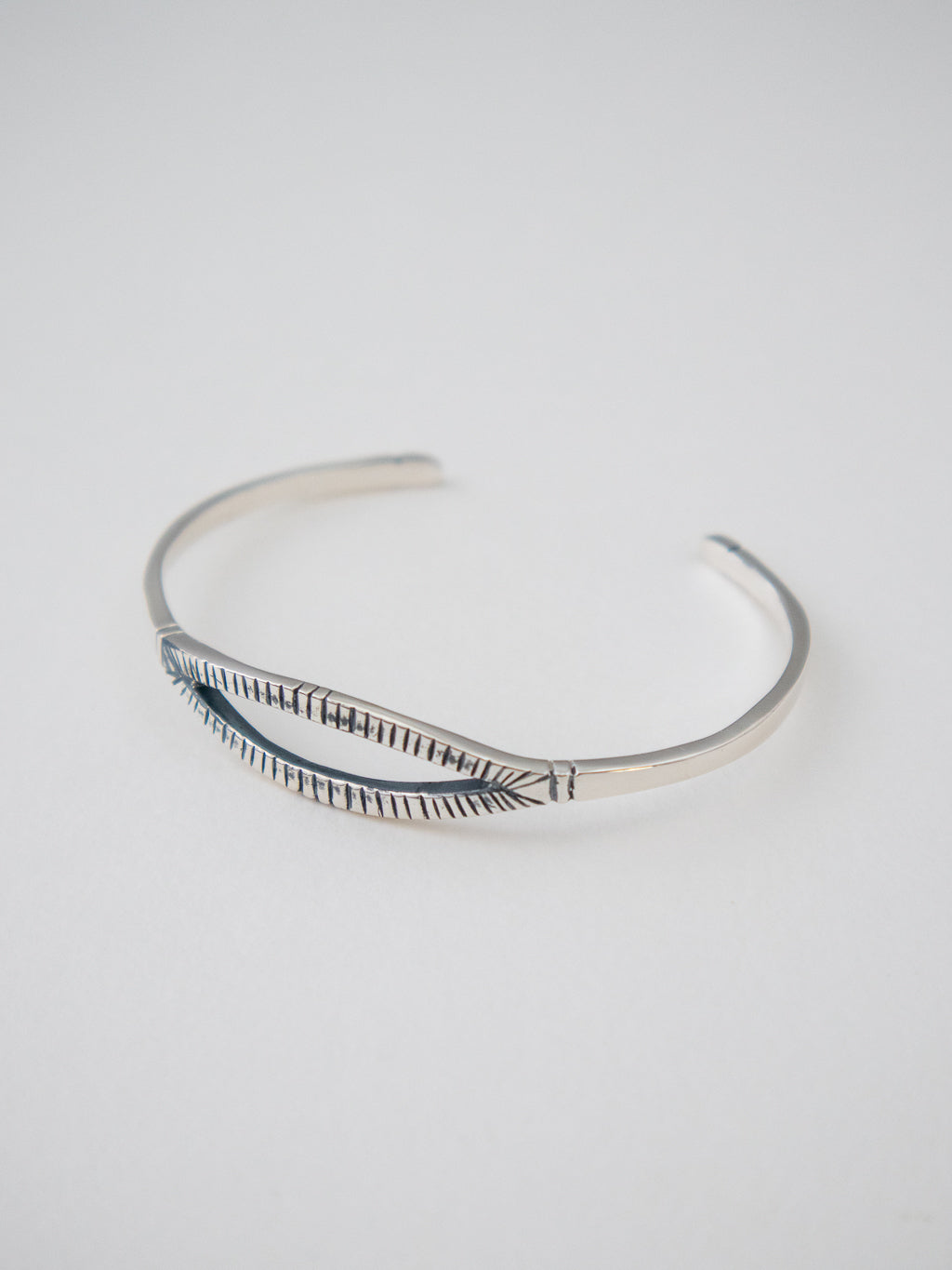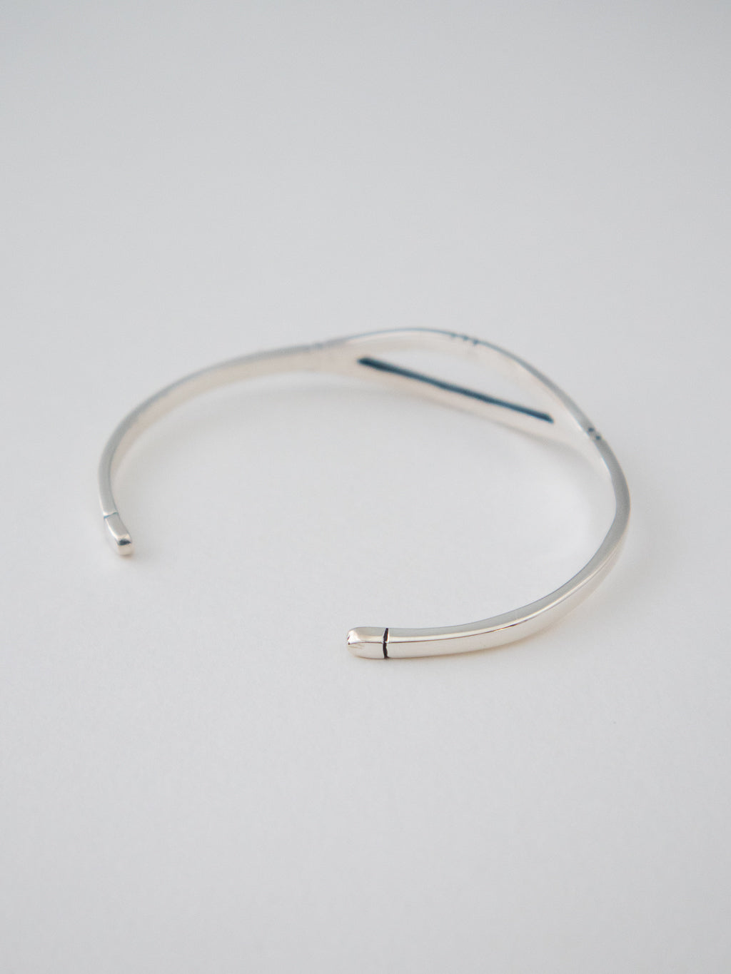 どこか民族的なムードを纏う、スターリングシルバー製のEyeバングル。中央が引き裂かれたようなシルエットが“目”を思わせ、さりげなくもインパクトを放ちます。東京発・eofmが描く唯一無二の世界観が、手元に個性とアート性を添えるアイコニックな一本です。
